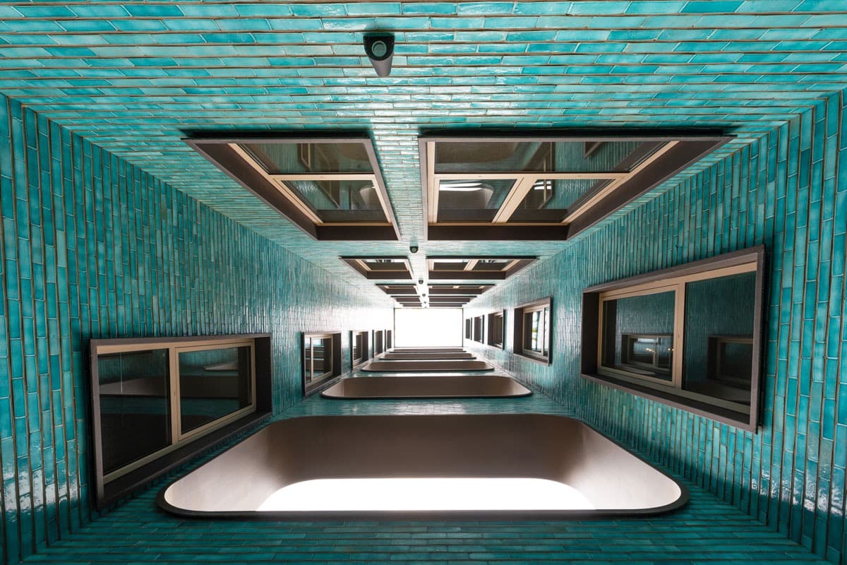 حجم همکف در گفتگو با خیابان از حجم اصلی عقبنشینی کرده و رابطه با شهر را از خلال سطح آجری خمیدهی دیوار پیرامونی برقرار می کند. ارتباط ورودی اصلی و خیابان با ایجاد یک فضای خالی به عنوان امتداد شهر در زمین پروژه تعریف شده، که این فضای واسط قابل دسترسی برای سواره نیز هست. آجر قرمز رنگ نما در حجم همکف و در بازشوهای نما، آنجا که شفافیت، نور و تعلیق بین درون و بیرون، کیفیتی متفاوت از ارتباط فضایی را ایجاد میکند، جای خود را به آجر لعابدار فیروزه ای رنگ داده است. در جدارهها، اعطای بعد سوم به بازشوها و تبدیل آن ها به فضایی میانه، ایوانهایی پیوسته ایجاد کرده که با لبه های سبز گیاهی، عمق و کیفیت ارتباط درون و بیرون را تقویت می کند.